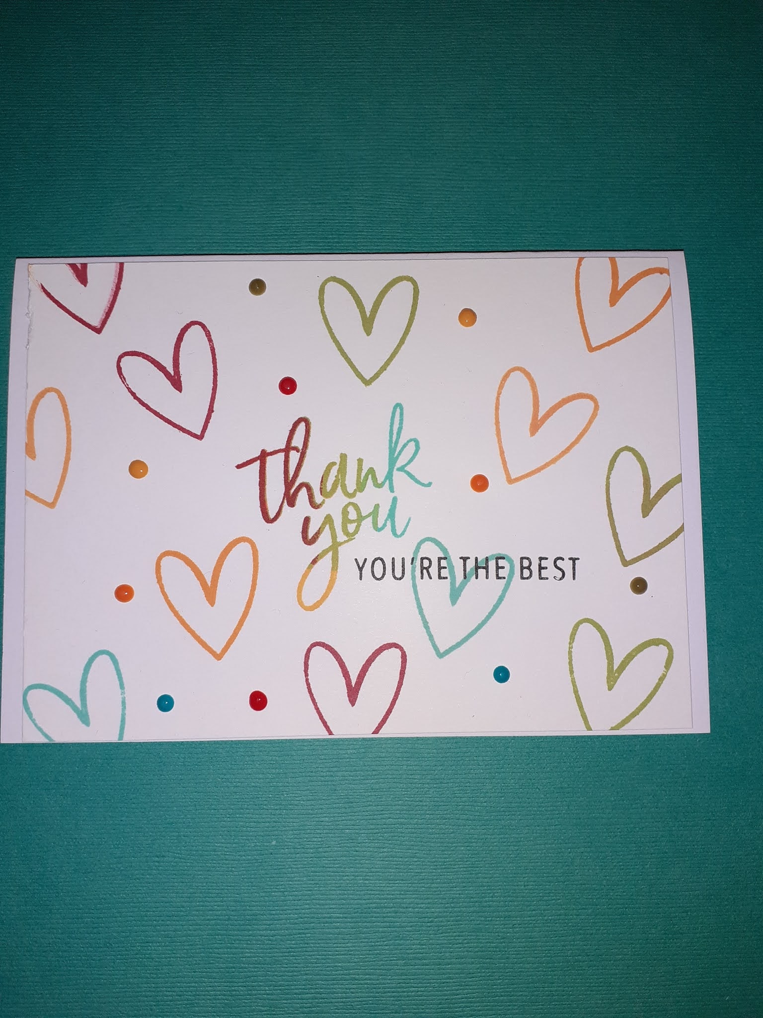 I then stamped randomly over the card stock with different coloured hearts. Then I stamped the sentiment as I had in the previous cards.The next step was to match up the nuvo drops with the coloured inks and add them.