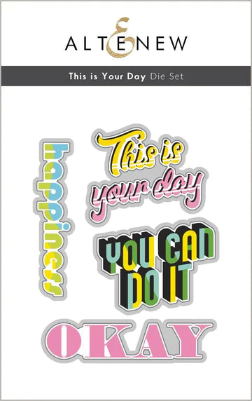Die Sizes: You can do it: 2.6" x 2" ▪ This is your day: 2.7" x 2" ▪ Happiness: 3.4" x 0.8" ▪ Okay: 3.7" x 0.8"