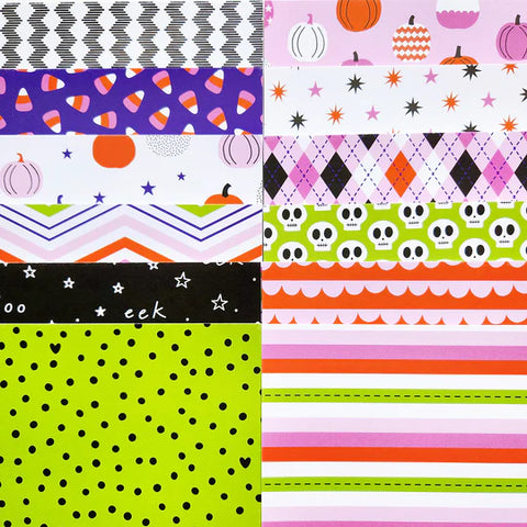This pack includes 12 patterns—some are favorites from the 6x6 pack reimagined in larger scale or fresh colorways, while others are brand-new designs exclusive to this 12x12 format. With 2 sheets of each, you’ll have plenty of paper for scrapbooking, treat boxes, party favors, and all your Halloween season projects.
