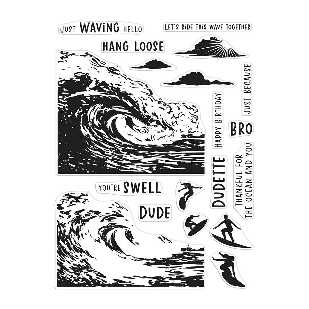 Featuring the perfect wave, 10 themed sentiments, surfers, and sun and cloud stamps this set will make you wish you were paddling into the surf, or at least enjoying the waves from the beach.