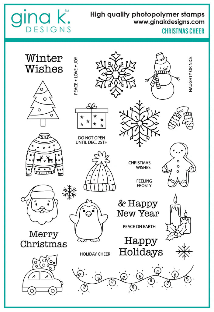 Christmas Cheer is a stamp set by Gina K Designs. This set is made of premium clear photopolymer and measures 6" X 8".   Made in the USA