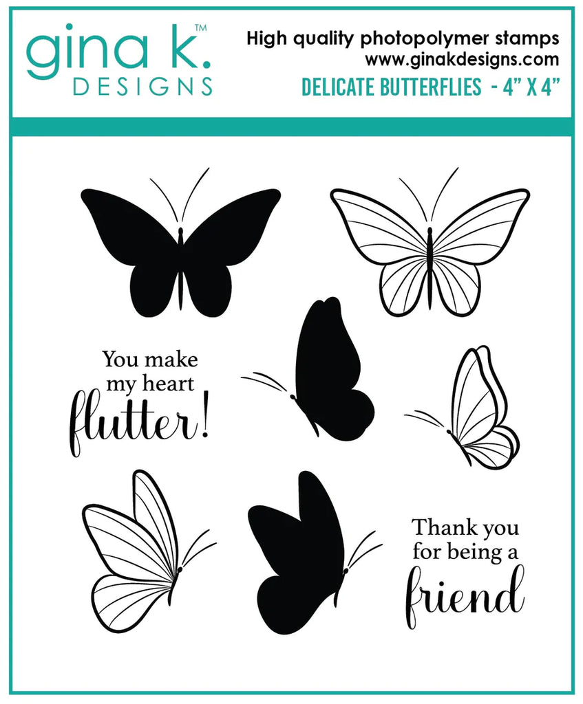 Delicate Butterflies is a stamp set by Gina K Designs. This set is made of premium clear photopolymer and measures 4" X 4".   Made in the USA