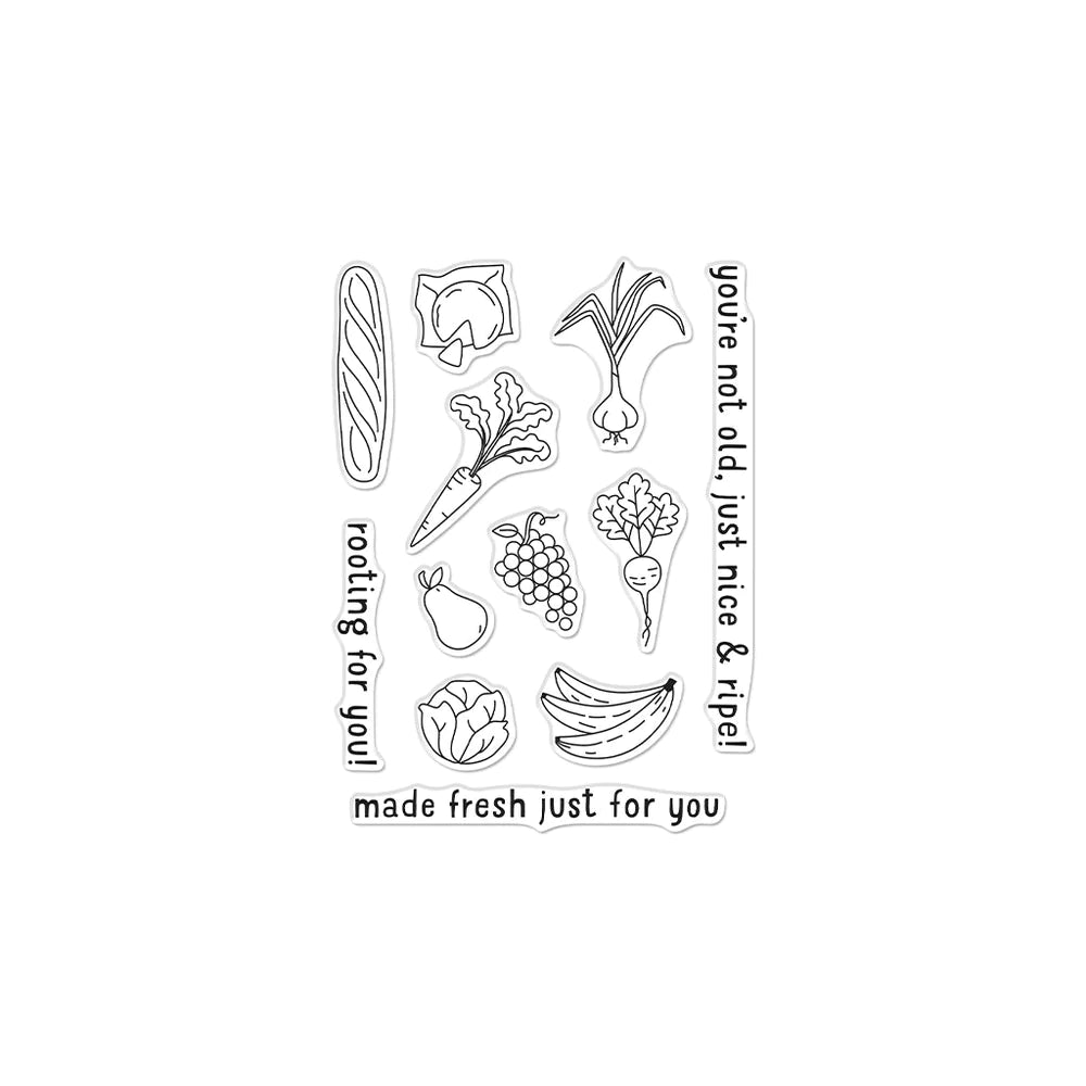 Vegetables, fruits, and cheeses come together in this small but mighty set that also has three themed phrases for the front, inside, or envelopes of your cards.