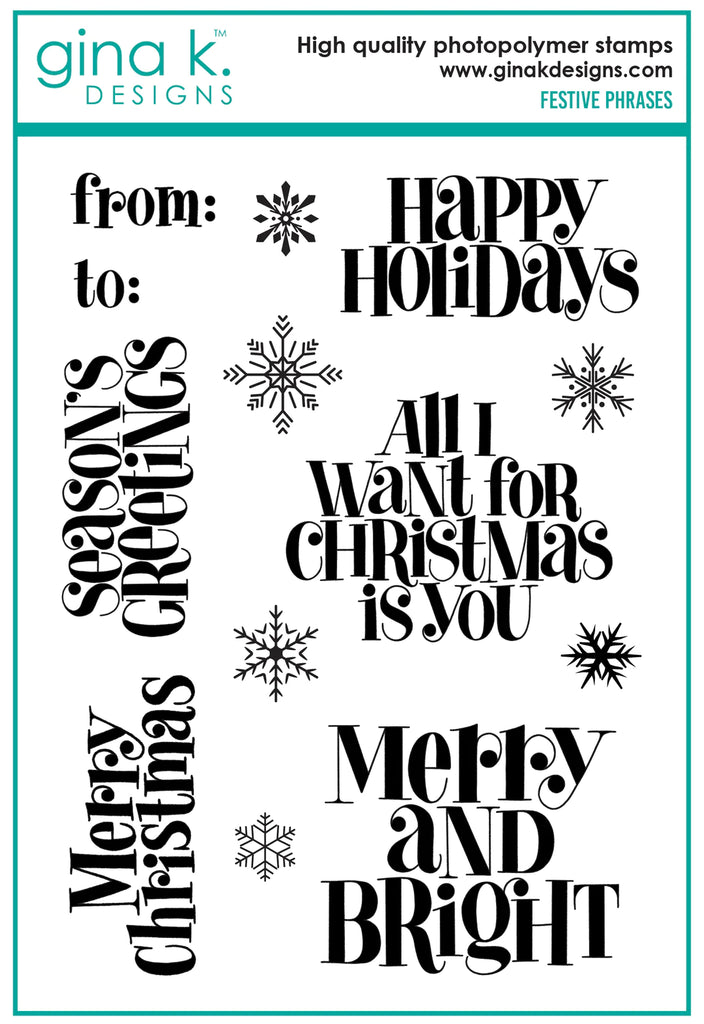 Festive Phrases is a stamp set by Gina K Designs. This set is made of premium clear photopolymer and measures 6" X 8". Made in the USA