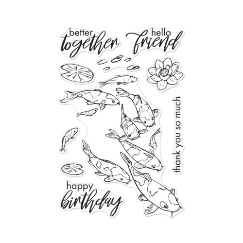 A lovely school of koi to grace your next card front or project. This stamp set features a large bunch of ten detailed koi, lily pads, bubbles and a blossoming lily. Also included are four sentiments that are meant to be used year round.