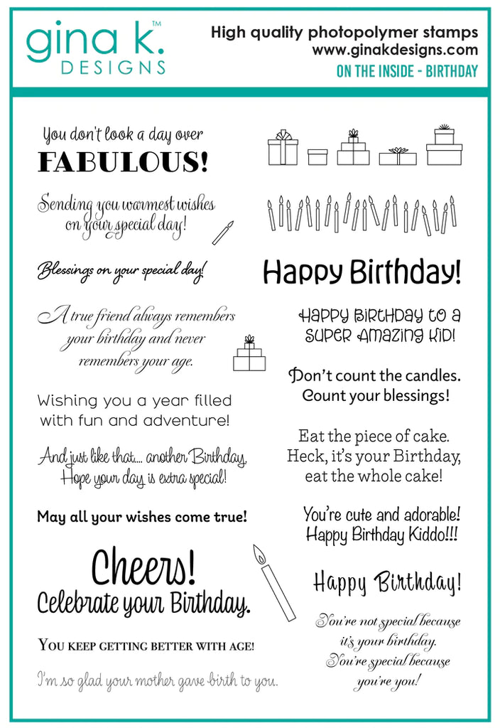 On the Inside- Birthday is a stamp set by Debrah Warner. This set is made of premium clear photopolymer and measures 6" X 8".   Made in the USA