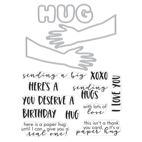 Send a paper hug to everyone on your list with this friendly set featuring large dies and seven mix and match sentiment stamps.