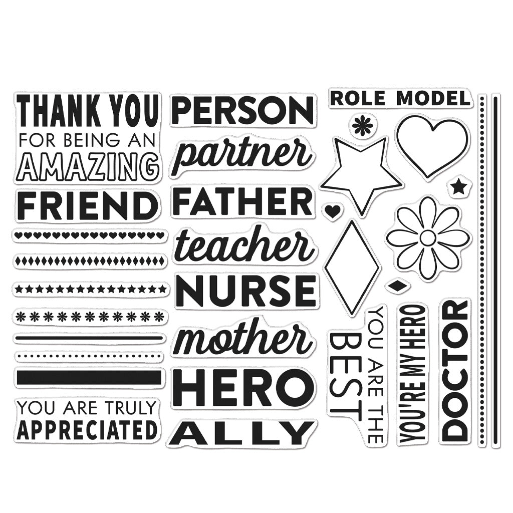 Build a graphic, poster-style sentiment on your card to celebrate the heroes in your community that you are thankful for. Featuring nineteen sentiments meant to be mixed and matched, silhouette shapes, and border options, this larger 6″ X 8″ set is one that you can use year round to recognize the wonderful people in your life.