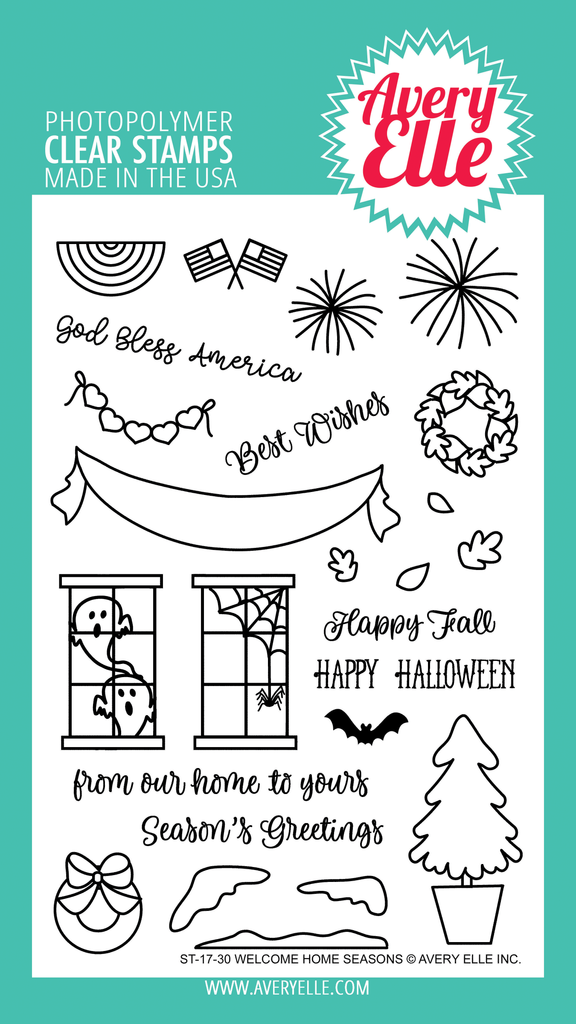 Our Welcome Home Seasons stamp set coordinates with our Welcome Home stamp & die set (ST-17-25 & D-17-25). Decorate the house for any holiday or season, such as 4th of July, Valentine's Day, Halloween, or Christmas. 25 total stamps. Banner measures: 2 3/4" x 3/4"; Flags measures: 13/16" x 3/8"; from our home to yours sentiment measures: 2 5/16” x 1/4”. Our Exclusive clear stamps are proudly made in the USA.