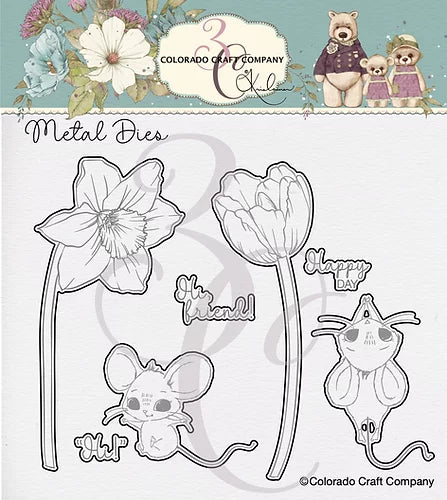 Every day is happy with the Daffodil Mice Dies featuring the illustrations of Kris Lauren for Colorado Craft Company! The package includes 7 thin metal dies that are compatible with most die cutting machines and coordinate with the Daffodil Mice stamp set (KL624 - sold separately). Dies include one large daffodil flower, one large tulip flower, two mice and the sentiments: "Hi," "Happy Day," and "Hi, friend!"