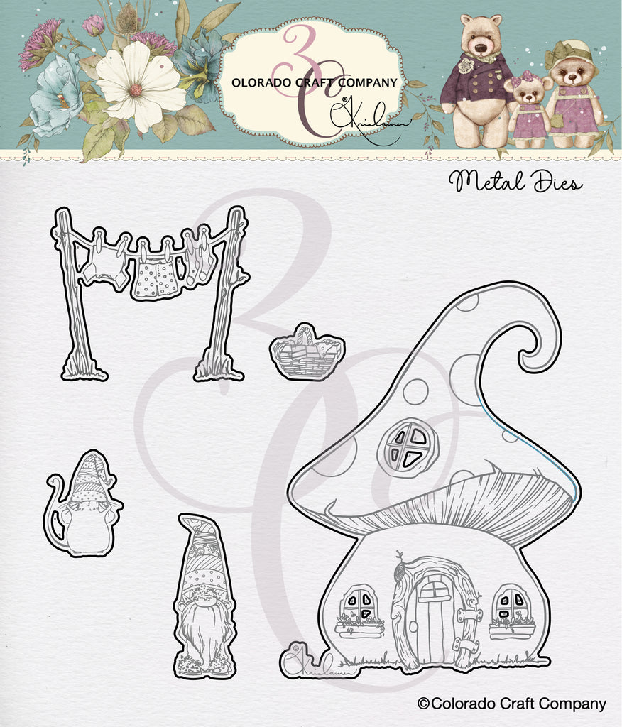 Create a dreamy home scene with the Gnome Home Dies featuring the illustrations of Kris Lauren for Colorado Craft Company! The 6.5 x 7-inch package includes 5 thin metal dies that are compatible with most die cutting machines and coordinate with the Gnome Home stamp set (KL610 - sold separately). The largest die is 4.25 x 3.25 inches and the smallest die is 0.6 x 0.8 inches. Dies include a gnome house, two gnomes, a tiny clothesline, and a small basket.