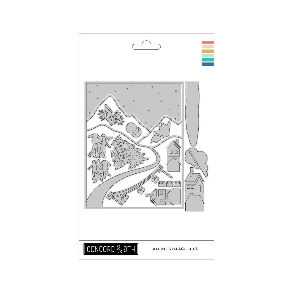 Creating charming mountain towns with the Alpine Village Dies! First you'll take the large die through your machine in a variety of colors and then piece them back together to create the background. Be sure start at the bottom right corner of the card so that everything will align properly. Once the base is ready, add trees, houses, a pond, ice skaters and more! Coordinates with the Alpine Village Stamp Set.