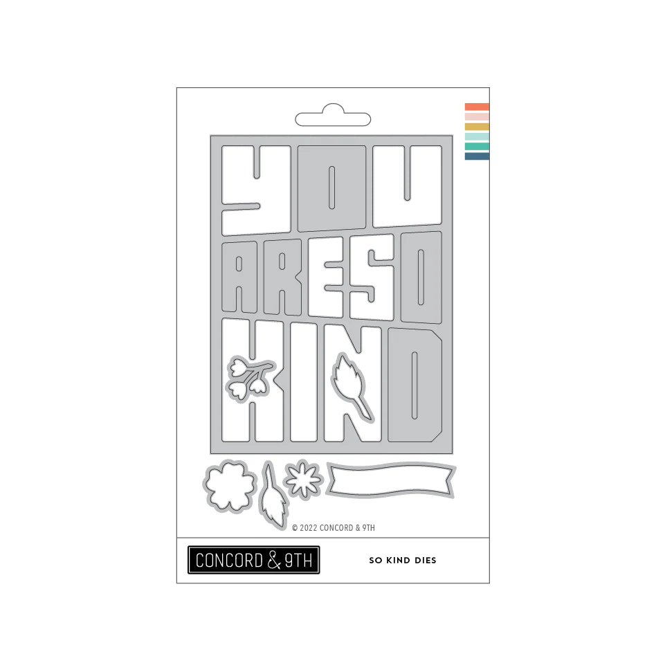 Say thank you in a big bold way with the So Kind Dies! The large die cuts out all the letters in the "you are so kind" sentiment and creates a template to help perfectly piece the sentiment back together, all in one pass through your die cutting machine! Once you've placed the the individual letters together you can turn the template into a greeting of its own. There are additional dies that cut around the imagery and small sentiment found in the coordinating So Kind Stamp Set. 7 dies.