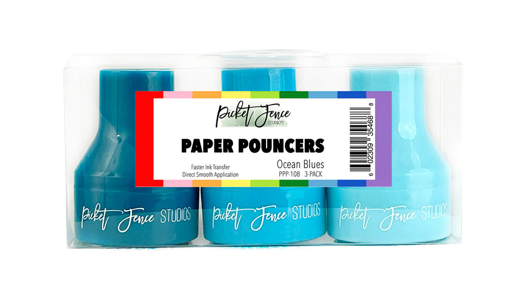 Paper Pouncers are a brand-new way to apply ink to die cuts, stencils, and many other paper crafting projects! These top quality super-soft SPONGE applicators are not your momma’s old inking tool! Paper Pouncers were custom designed by Picket Fence Studios to make applying ink easier, faster, and more comfortable on hands. Simply add ink onto the sponge head and pounce away! Use with water-based inks or watercolors, and clean with a damp cloth or wipe. Each Pouncer comes with its own color coordinated holder for simple storage and display.