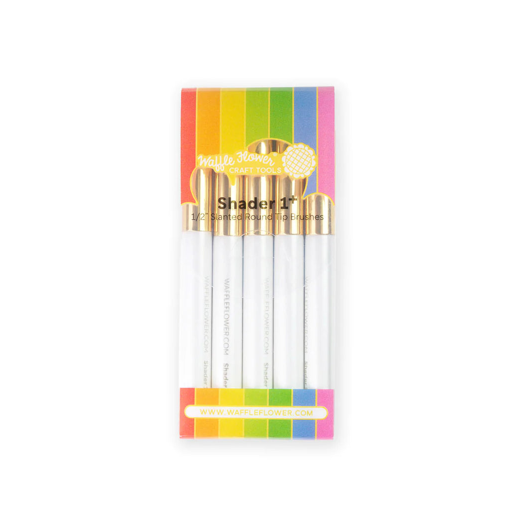 Made from high-quality, ultra soft bristles, the Waffle Flower Shader 1+ brushes are round-tip brushes with bristles arranged at an angle for comfort and precision. For best results, apply in a "drag-n-lift" or "flicking" motion. As the name suggests, the plus versions allow you to apply a dense layer of ink, very quickly. We designed the original shader brushes for adding colors gradually, you can build up the density by applying multiple layers of ink. As for the new plus versions, they can help you color in really quickly, especially when using stencils.
