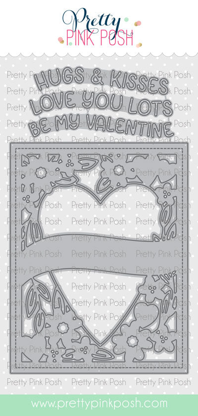This high-quality steel craft plate measures 4 ¼” x 5 ½”. Die set includes 4 pieces. Words for banner include: hugs & kisses, love you lots, and be my valentine.