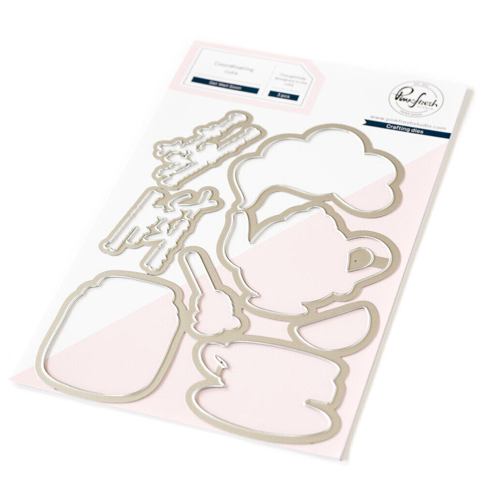 3 pc die set to coordinate with the Get Well Soon stamp set and Get Well Soon layering stencil set. There is a 1-piece die that cuts the tea themed images out with one pass through a diecut machine. There are also dies for cutting out the two larger scripted sentiments included in the stamp set.