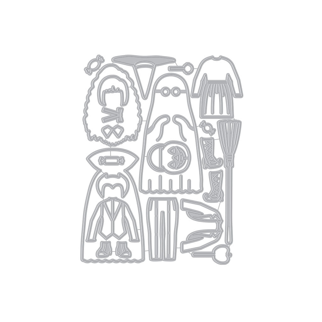 Turn your Hero Lifestyle figures into Halloween party goers with this fun and spooky set. With twenty three dies including costume pieces, foot wear, and candies, this set is perfect for Halloween cards, party invitations, paper doll kits, cupcake toppers and more.