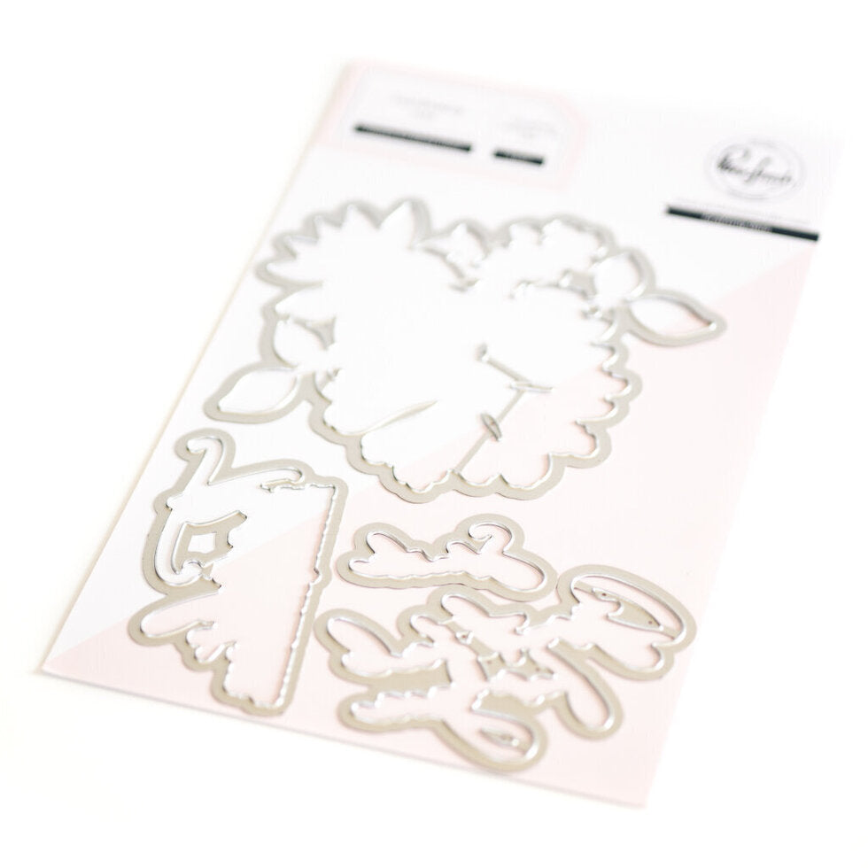 4 pc die set to coordinate with the Thanks for Being There stamp set, and Thanks for Being There layering stencil set. This die cuts around the floral element, leaving a thin border. There are also three dies to cut out the larger, scripted sentiments.