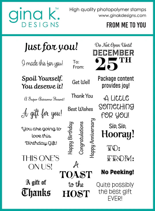 From Me to You is a stamp set by Debrah Warner. This set is made of premium clear photopolymer and measures 6" X 8".   Made in the USA