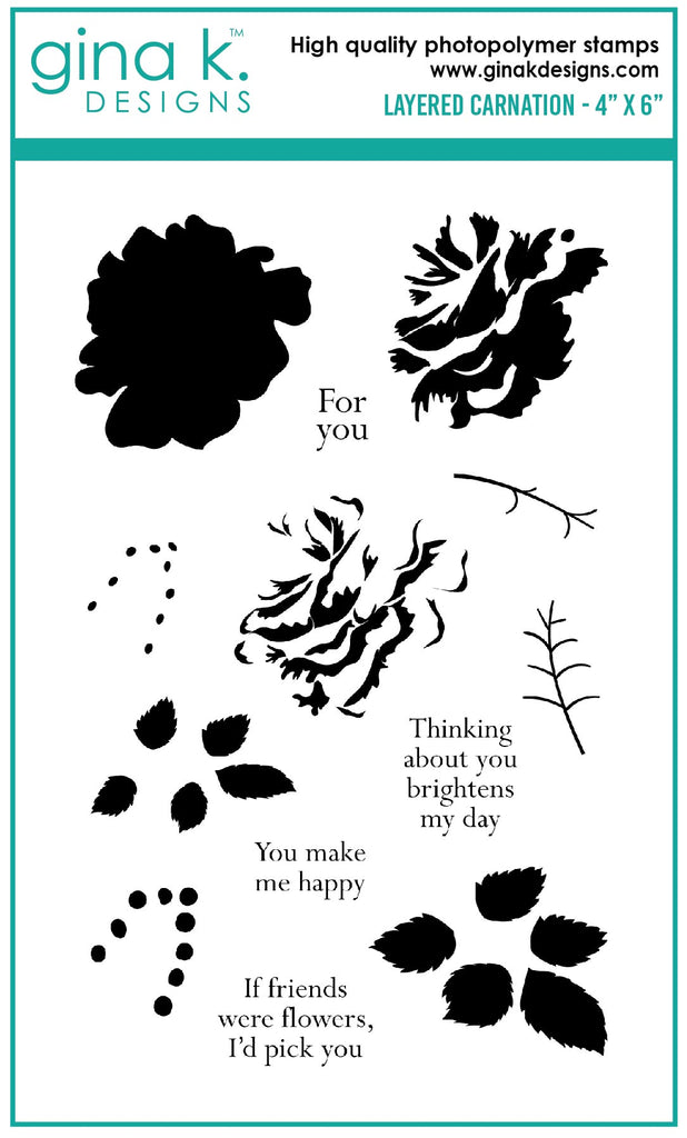 Layered Carnation is a stamp set by Gina K Designs. This set is made of premium clear photopolymer and measures 6" X 4".   Made in the USA