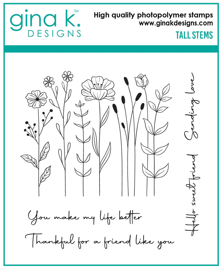 Tall Stems is a stamp set by Gina K Designs. This set is made of premium clear photopolymer and measures 4" X 4". Made in the USA