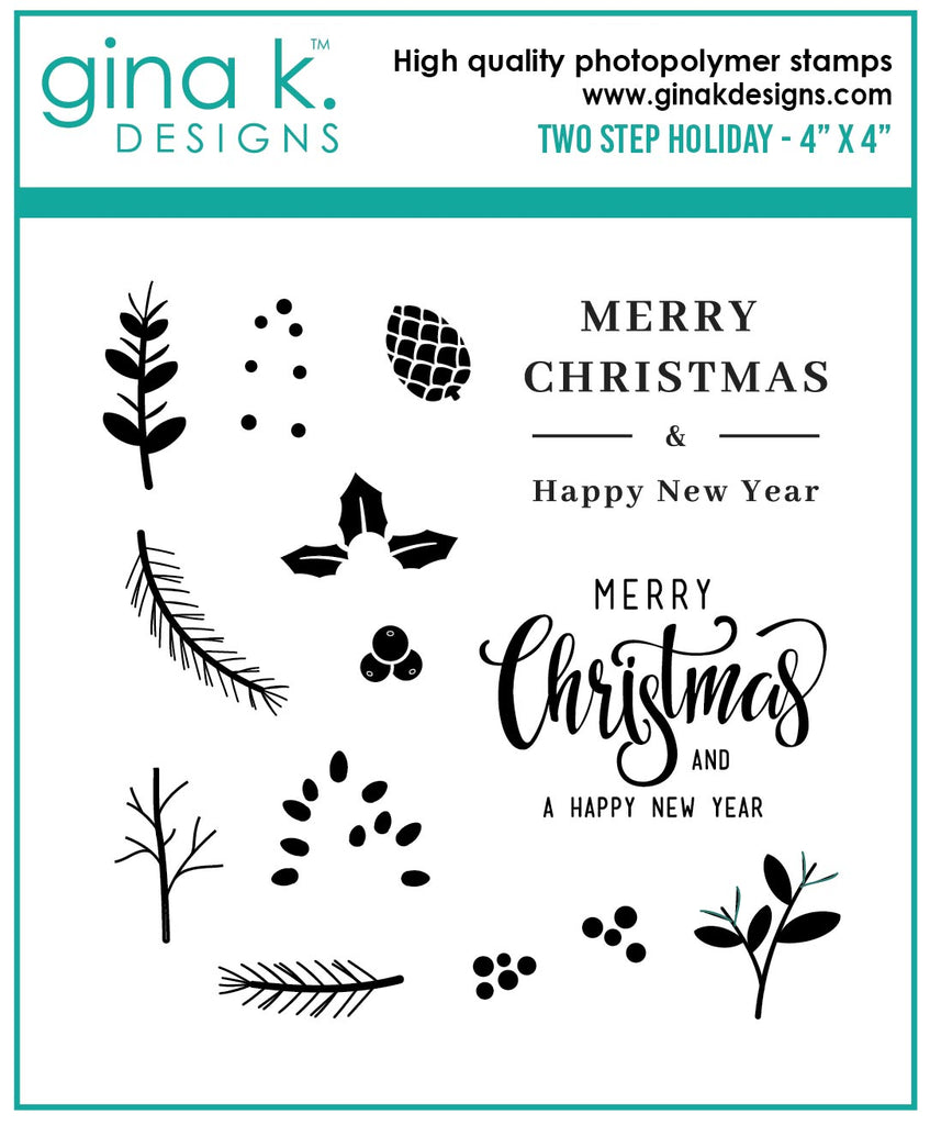 Two Step Holiday is a stamp set by Gina K Designs. This set is made of premium clear photopolymer and measures 4" X 4". Made in the USA