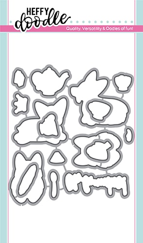 A set of 16 metal cutting dies that coordinate with the Oh Crumbs stamp set HFD0133. Includes metal cutting dies for all four corgi dog images and the other scene building stamps - teapot, tea drip, two teacups, milk / creamer jug, sugar bowl, plate, spoon, two sandwich stamps and a crown. This die set also includes a metal cutting die for the 'Oh Crumbs' script sentiment stamp.