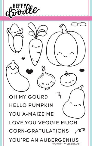 This a-maizing set of 19 stamps will leave you with a hunger to get crafty! Includes 7 smiley vegetable images including a pumpkin, a butternut squash (gourd), a carrot, an ear of corn (maize), an onion, a tomato and an aubergine (eggplant). Also includes a selection of 6 veggie related sentiment stamps, some hearts and a pair of glasses for the auber-genius! Coordinates with the Veggie Patch die set HFD 0083.