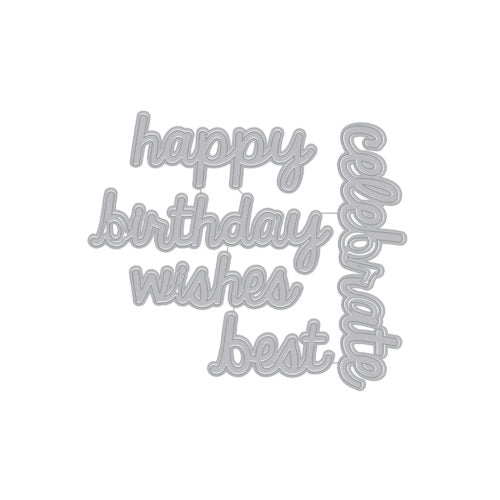 Celebrate die measures 3.5″ x .88″, happy 2.36″ x 1″, birthday 3.25″ x 1″, wishes 2.25″ x .75″, best 1.5″ x .75″.