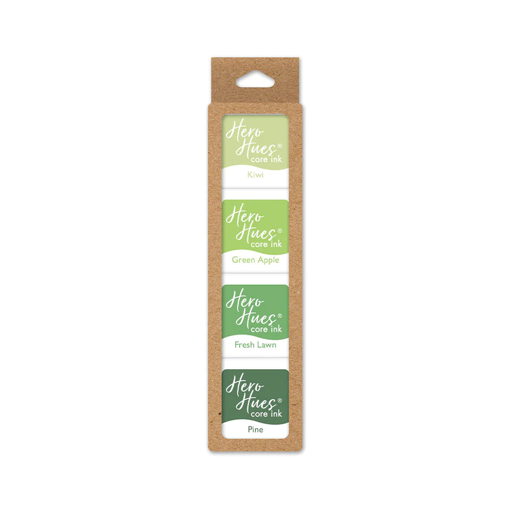 A 4-pack of 1.25" x 1.25" Hero Arts Core Ink Cubes featuring Kiwi, Green Apple, Fresh Lawn and Pine inks.