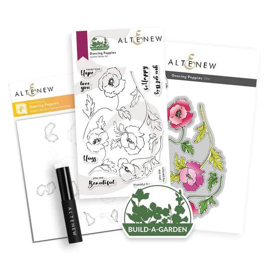 Inspired by brush pen art, the stamp set showcases four graceful poppies. Every thoughtful brush stroke expresses the delicacy these flowers possess. All four flowers and a leaf are included in one stamp, making them easy to color with the coordinating stencils and cut with the one-piece die.