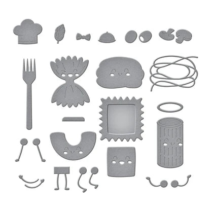 Pasta Friends Etched Dies are from the Buon Appetito Collection. Create fun pasta shaped characters with this set of 18 thin metal cutting dies! There are five pasta shapes (Rigatoni, Farfalle, Macaroni, Ravioli and Spaghetti) with accessories like arms, legs, hats, bowties, veggies and more! Make a cute couple or make a whole crew.
