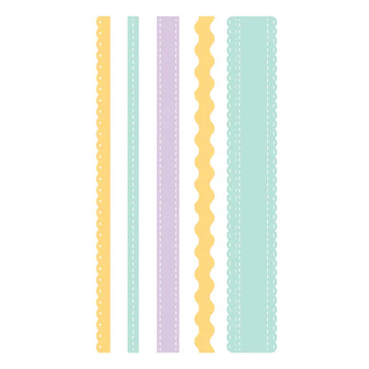 Ribbon & Trim Etched Dies are part of the Say Cheese Classic Pooh Baby Collection with Simple Stories. This sweet set cuts five different decorative edged designs. Cut them out twice to make a 12-inch length for scrapbook pages. Cut them out several times for a background. So many design opportunities with this set of five thin metal cutting dies!