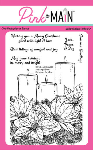 Create warm, heartfelt holiday cards with glowing pillar candles surrounded by detailed poinsettias and evergreen branches. Pair the elegant imagery with festive greetings for handmade cards that shine with peace and joy.