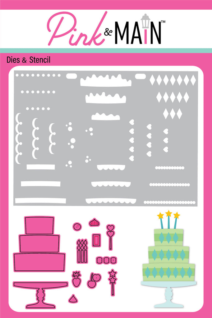 This combination set includes dies to cut out the elements of a tiered birthday cake, complete with candles, fruit, and embellishments, and a stencil to add various decoration styles to the cake.