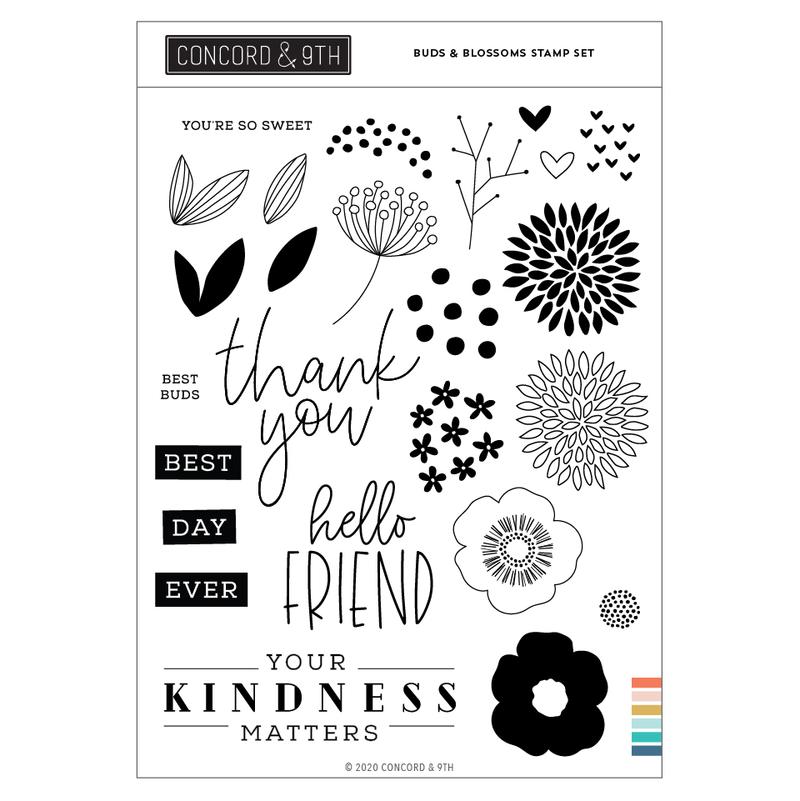 Create delightful backgrounds and focal points with the Buds & Blossoms Stamp Set! Stamp the bold and outlined floral images on their own or put them together for three different looks. This set also comes with sweet sentiment to help you spread love, gratitude, and encouragement. 6" x 8". 25 stamps.