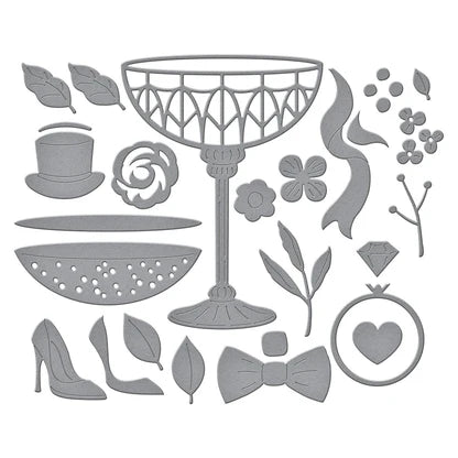 A Special Toast Etched Dies are from the Happier Hour Collection. When assembled, this set of 22 thin metal cutting dies creates many kinds of elegant drinks in a detailed cut coupe glass. The liquid in the glass even has a bubbles pattern with the insert die. For extra fun, there are accents to set the mood: flowers, bowtie, high heels, ribbon and more!