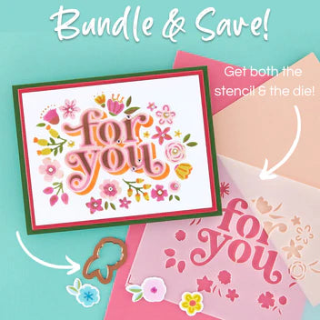 The Floral For You Stencil and Die Bundle combines STN-050 Layered Floral For You Stencils with its coordinating S3-471 Floral For You Etched Dies. Together, it creates a sweet burst of florals framed around the For You sentiment with the four piece layering stencils. Use the five cutting die set to cut out the sentiment and four floral elements to bring more interest and dimension.