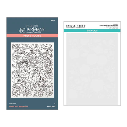 Winter Rose Background BetterPress and Stencil Bundle is from the Handmade Holidays Collection. It includes BP-195 Winter Rose Background Press Plate and STN-091 Layered Winter Rose Background Stencil. The set presses a beautiful rose background and adds color to the blossoms with four 5 x 7 in./12.70 x 17.80 cm durable mylar stencil sheets. The Layered Winter Rose Background Stencil is exclusive to this bundle set.