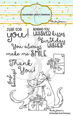 Sentiments include: "Just for you", "Sending whisker kisses & birthday wishes", "You always make me smile", "Thank You", and "Just because!"