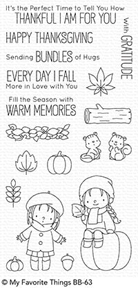 You’ll quickly fall in love with this autumnal collection from Birdie Brown. This set features a duo of sweater weather-ready characters bedecked in seasonally appropriate attire – hats, scarves, jackets, and boots. Create inviting scenes with the included animal friends and accents. Use the extra pumpkins to create a patch full of fun or use the leaves to build a pile of colorful leaves for our adorable girls to frolic in. Finish your card with one of the six included sentiments geared towards Thanksgiving, autumn, and feelings of gratitude.
