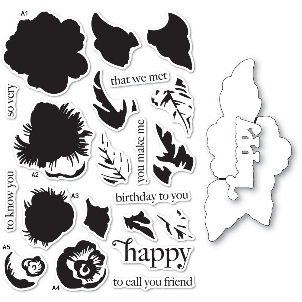 6 x 8 inches clear stamp set, 3.7 x 1.8 inches matching die, 1.7 x 0.7 inch happy matching die