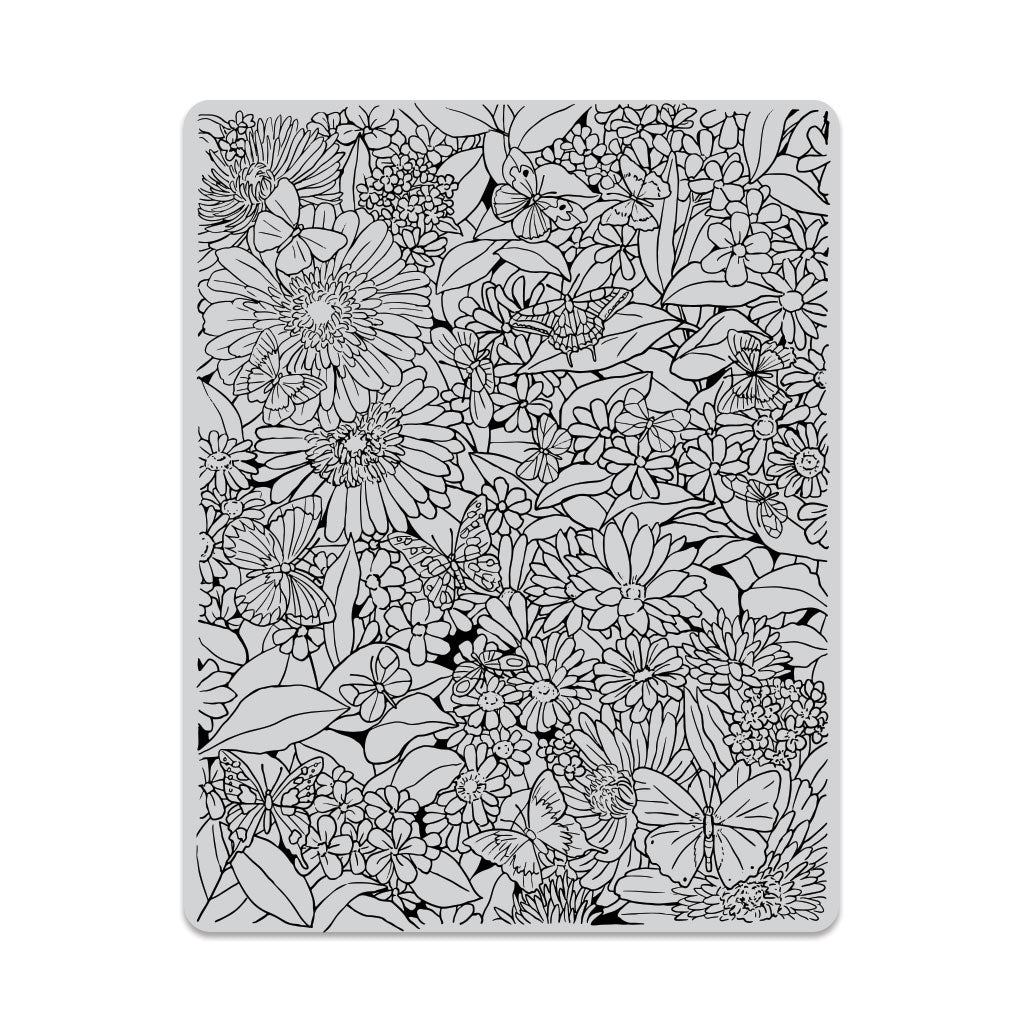 If you are looking for a background to showcase coloring techniques, this A2-sized background cling stamp is for you. Designed with flowers clustered close together, interspersed with butterflies and leaves, this stunning background is ready for your favorite colors of markers, watercolor or pencils. Add a touch of glamour with one or two of our Glimmer Metallic liquid inks for a little something extra. Equally beautiful simply embossed on colorful cardstock.