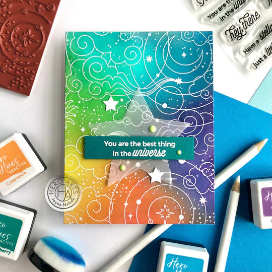 Swirls of stars, a radiant sun, layers of clouds, and plumes of stardust combine to make this delicate and ethereal background stamp.