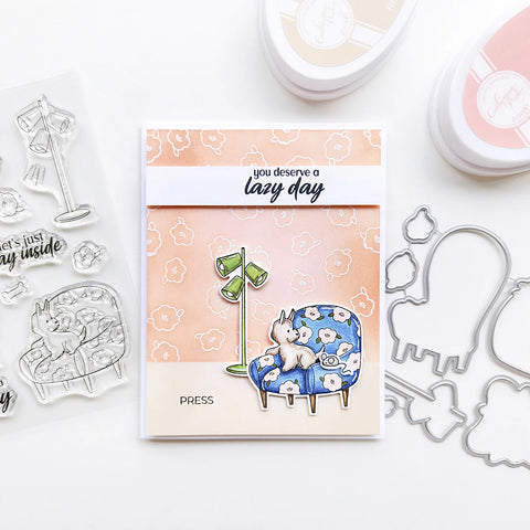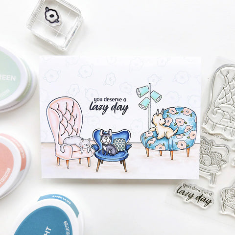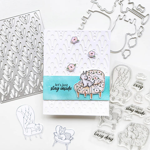 The Cozy Pets Stamp Set features three adorable line-art stamps of cozy chairs with cats and dogs curled up, keeping your spot warm. Color them with your favorite markers or mediums to create charming focal-point images. The set also includes a modern lamp and a few cute accents to complete each scene. Perfect for sending a “deserves a lazy day” card, these stamps pair beautifully with the coordinating Cozy Pets dies to add dimension to your cards or scrapbook pages.