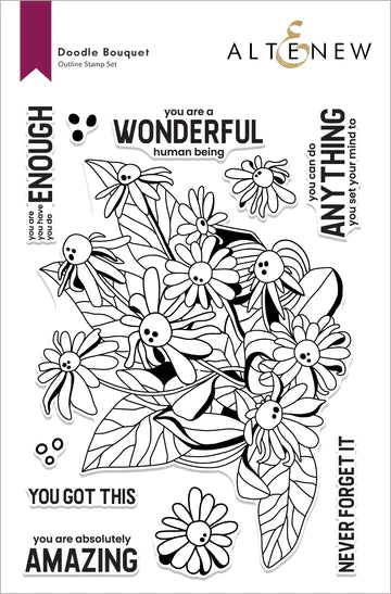The Doodle Bouquet Stamp Set showcases a unique and stylish floral arrangement of whimsical daisies. The designer's use of simple shapes with intricate line details makes the images pop! The six motivational sentiments, along with the two additional flower images are perfect to fill in extra spaces, or to stamp and cut to place over the main flower arrangement. This will add depth to your project!