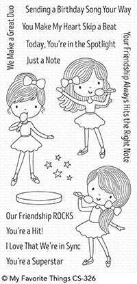 Friendship Rocks features three sweet songstresses in a variety of poses…from softly crooning to all-out belting. Combine them into one fabulousgirl group or showcase them singularly, perched upon the included stage. Accent your concert with a cluster of stars and add a rocking sentiment for the encore. Finally, present your look to raucous applause for the lucky recipient!