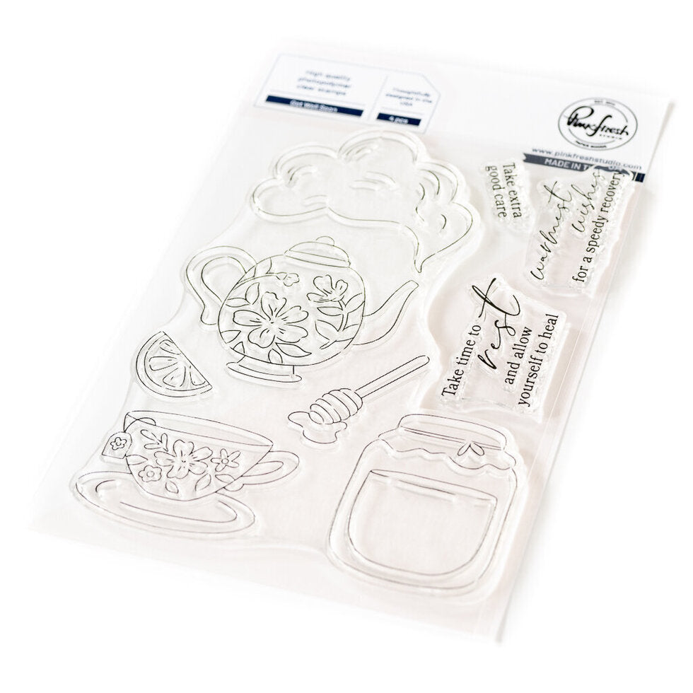 Send healing wishes to sick family & friends with this heartfelt and loving get well stamp set! The tea themed images are merged onto one stamp, making them easy to align with the coordinating layering stencils and 1-piece die.