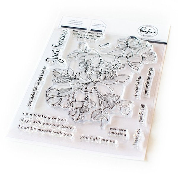 Stamp the stunning outline florals in black, or heat emboss them in gold for some added shine. Color them in with our liquid watercolor or alcohol markers, or do the no-line coloring technique with water brush markers or colored pencils. Made to coordinate with the Just Because die set. Available for purchase separately.